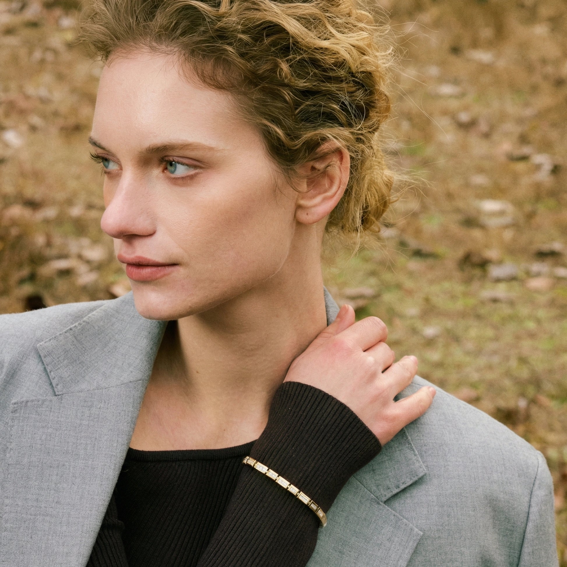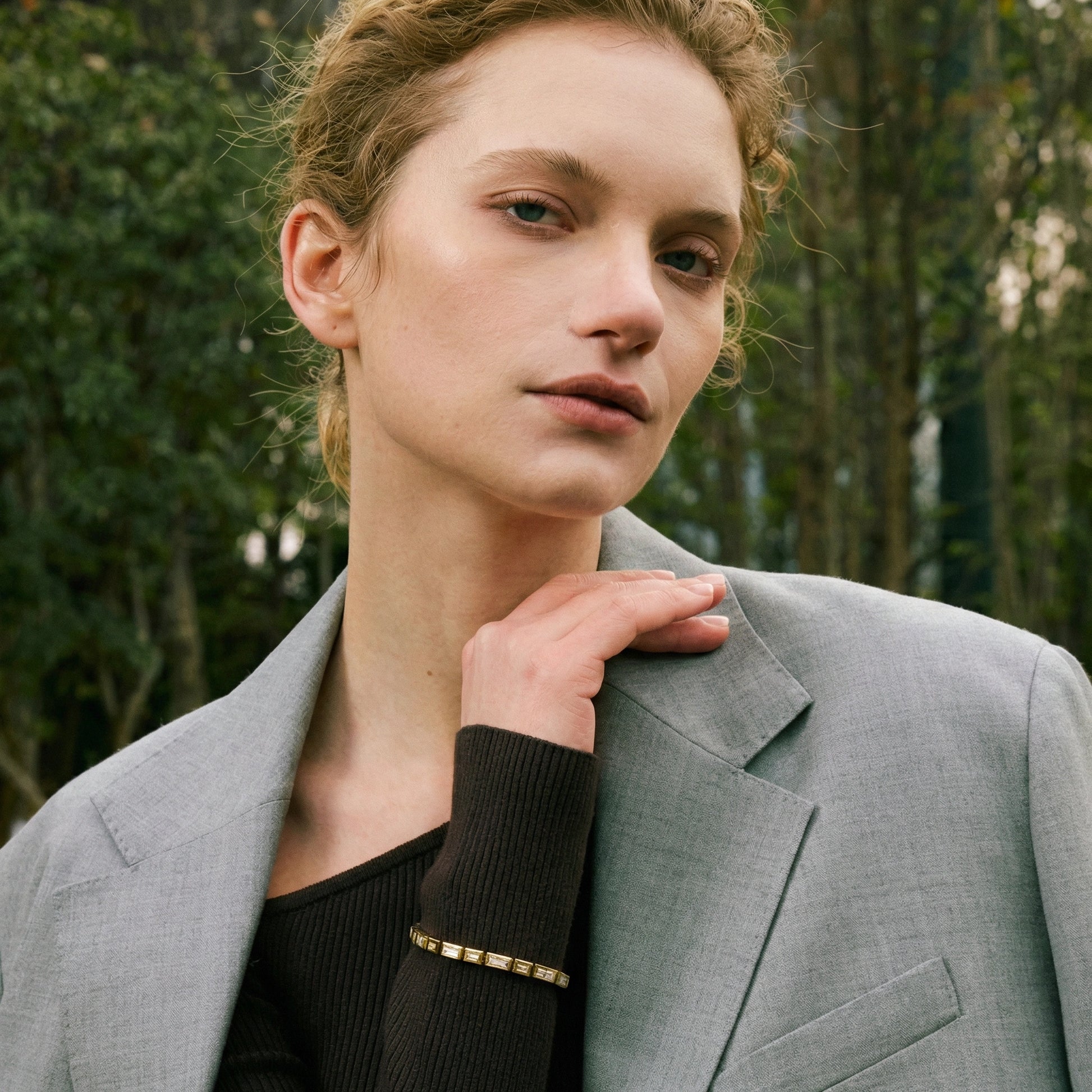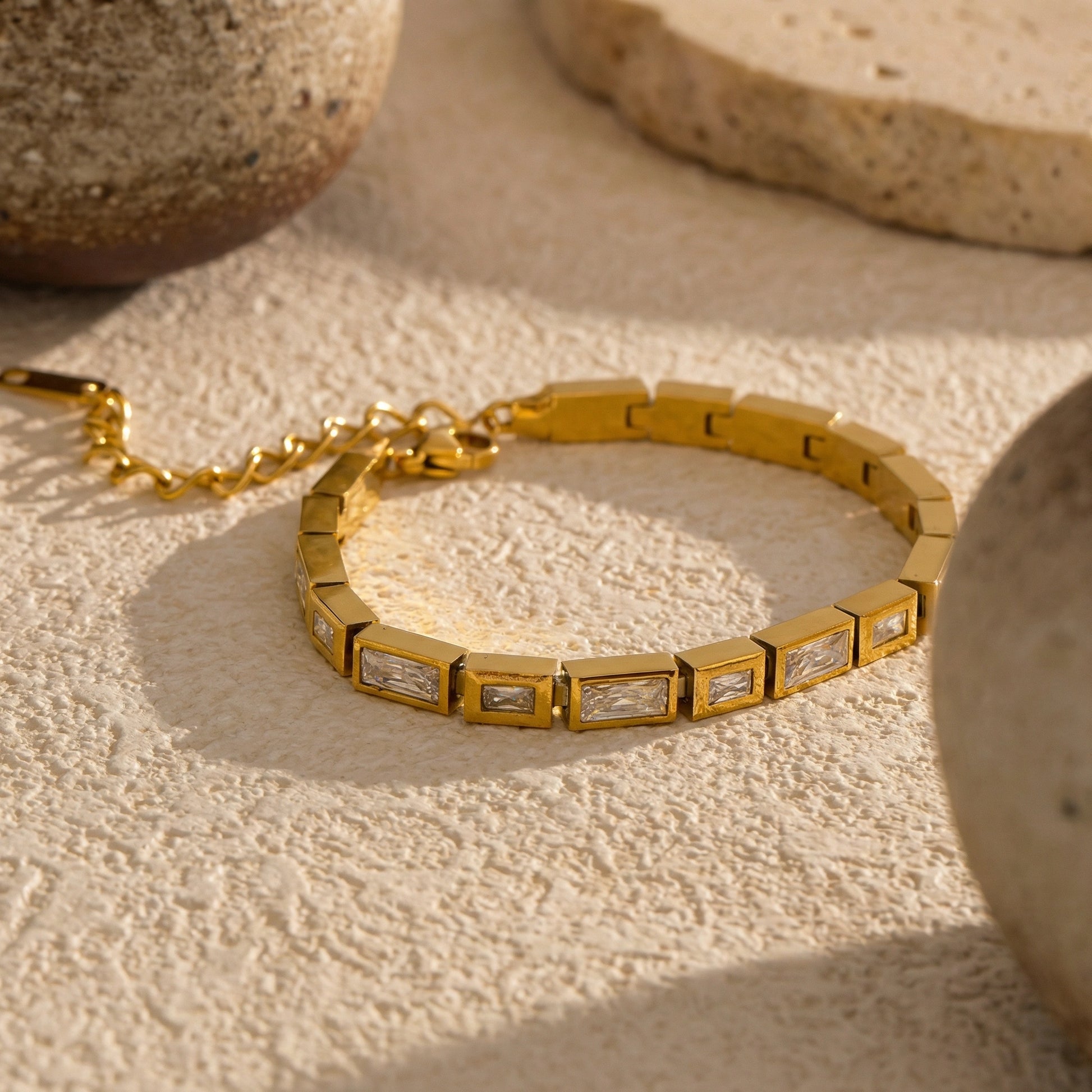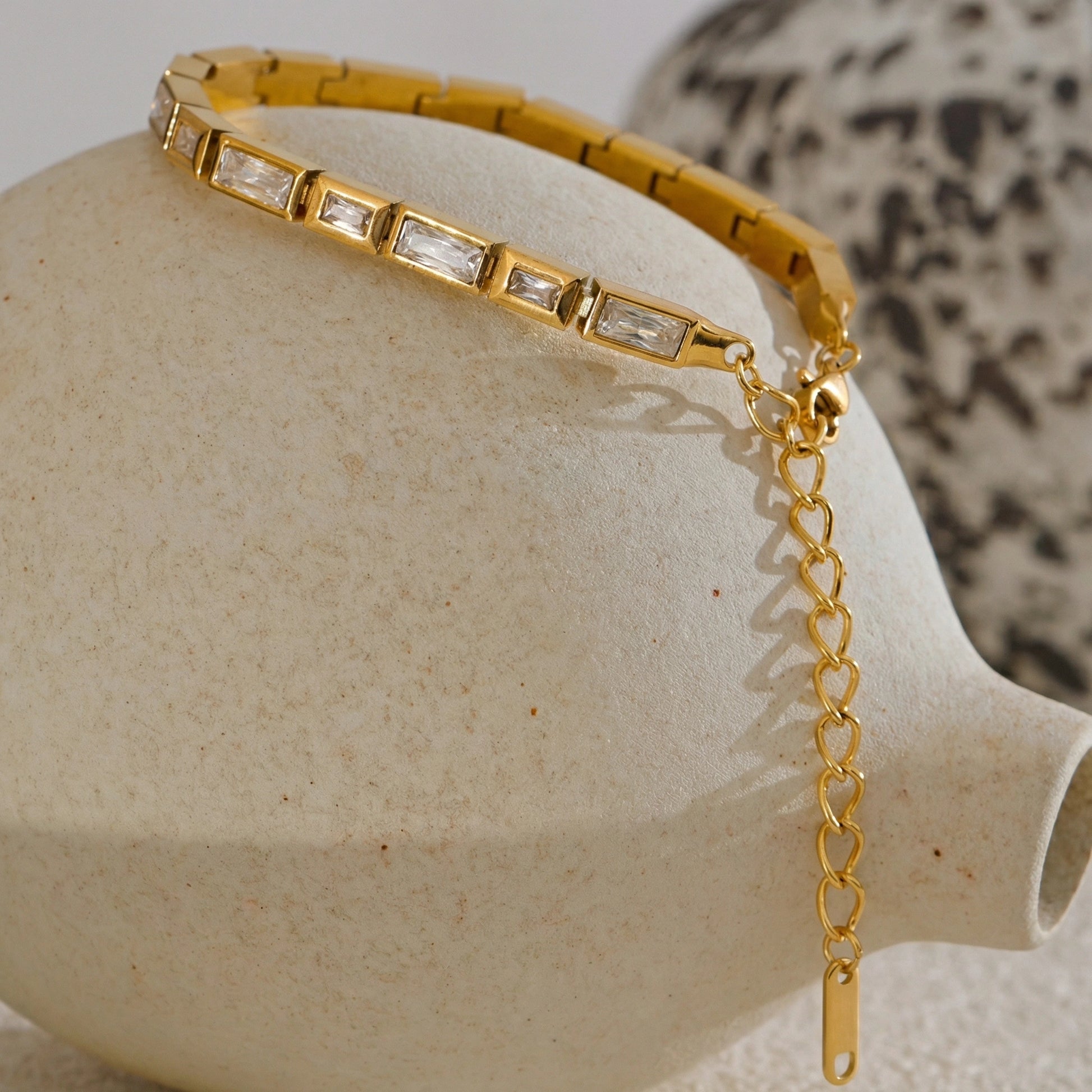 Structured link bracelet featuring rectangular baguette-cut cubic zirconia set in polished stainless steel. Refined shine with a modern edge — designed to elevate both everyday and evening looks.