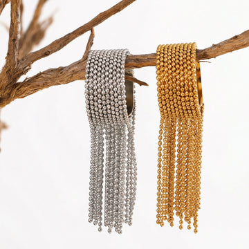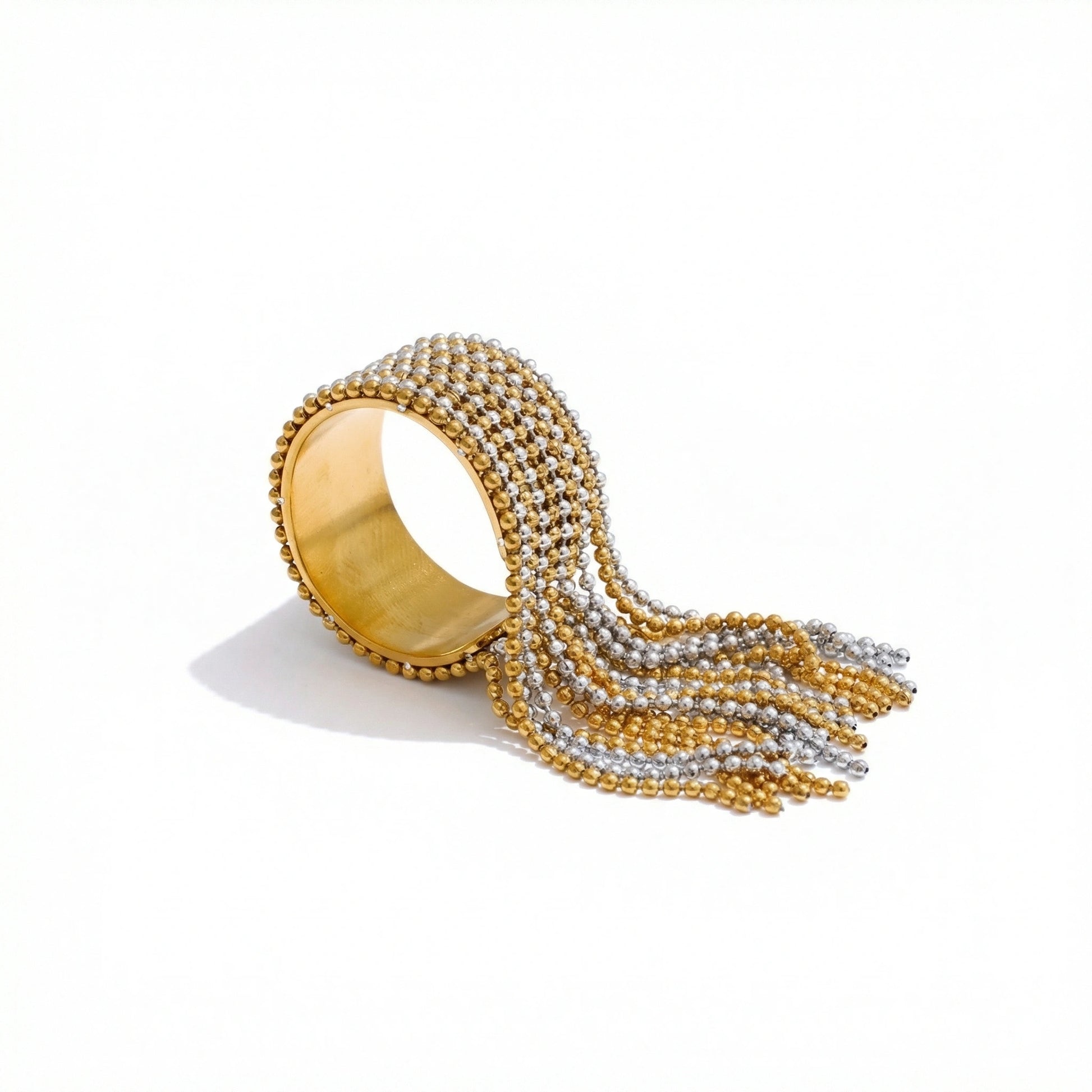 Bold statement ring featuring cascading chain tassels and a textured band design. Designed to move with the hand and catch the light — expressive, fashion-forward, and made to stand out as the focal point of any look.