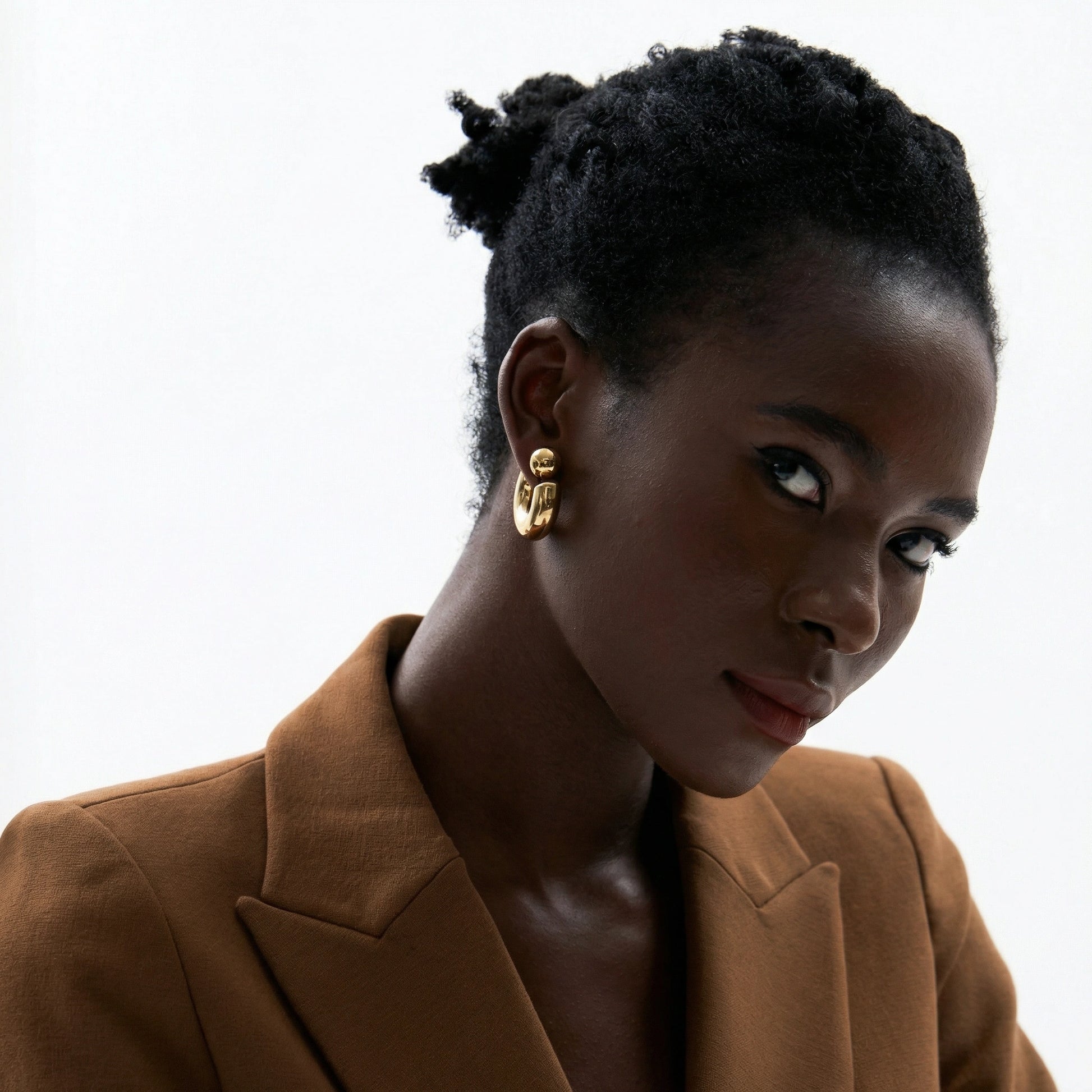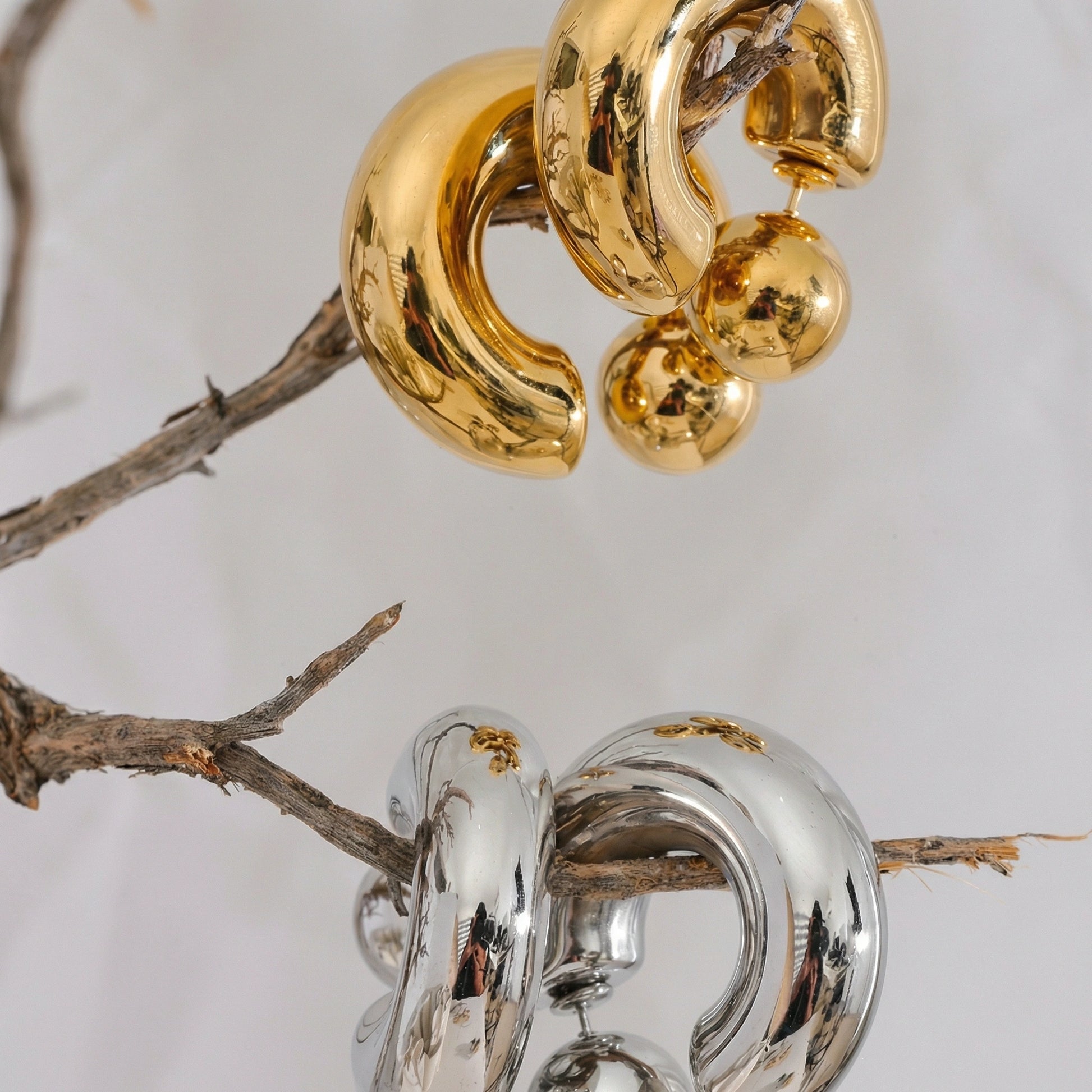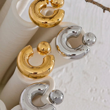 Bold C-shaped earrings with a smooth sculptural profile and high-shine finish. Designed as a statement piece with strong volume and a modern silhouette. Eye-catching yet refined, perfect for elevating minimalist looks.