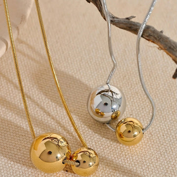 Minimalist necklace featuring two smooth, high-polish spherical pendants in a balanced, sculptural form. Clean, modern, and designed for effortless everyday wear — perfect worn solo or layered.