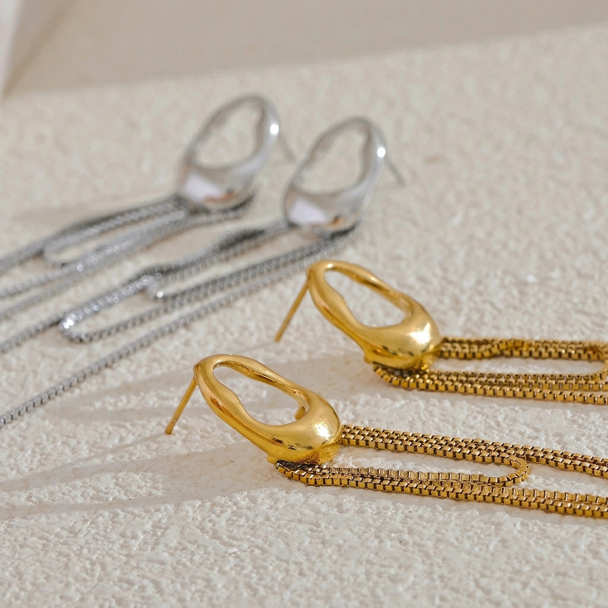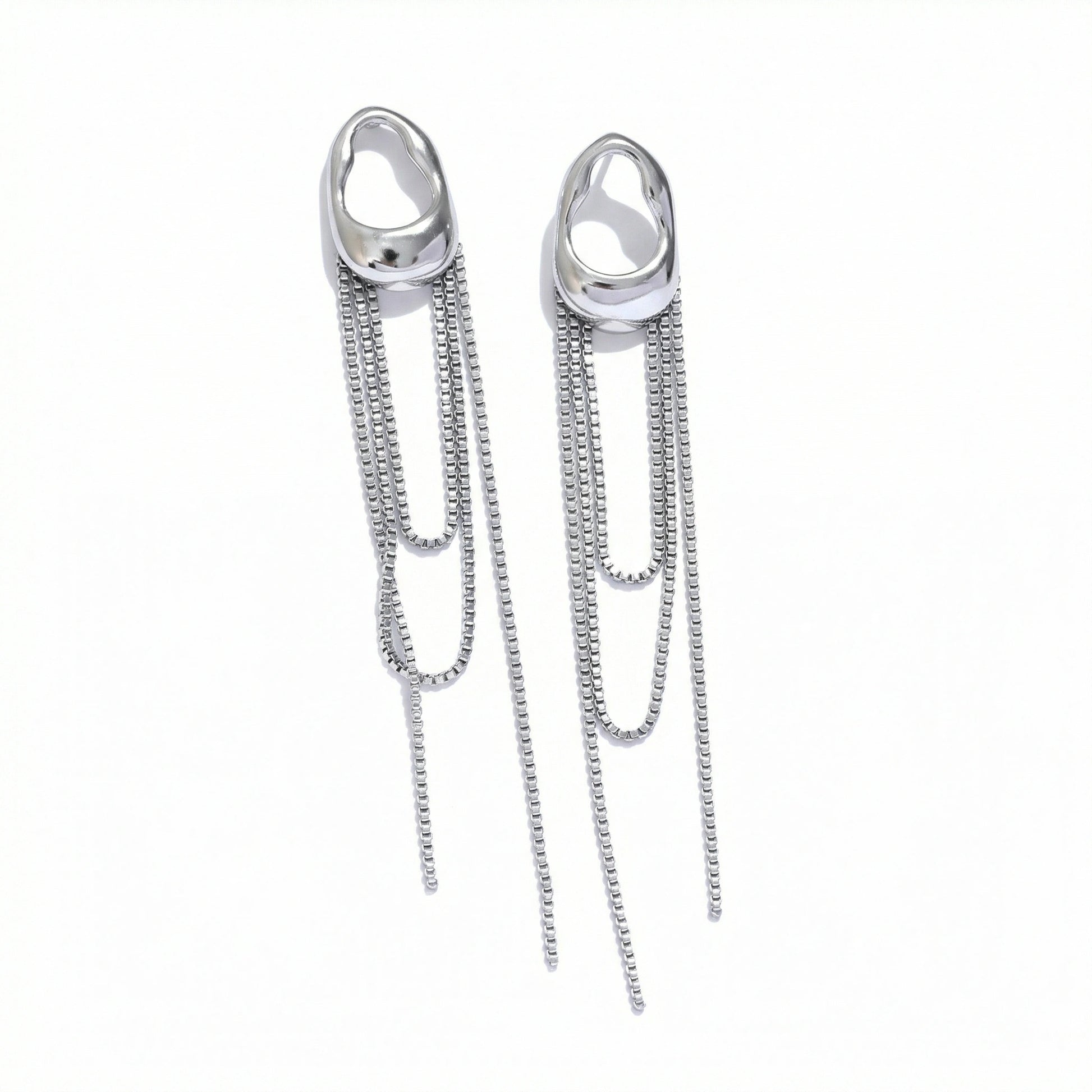 Sculptural geometric earrings finished with elongated chain tassels. A refined metal form paired with fluid movement creates a bold yet polished look designed for confident everyday wear.