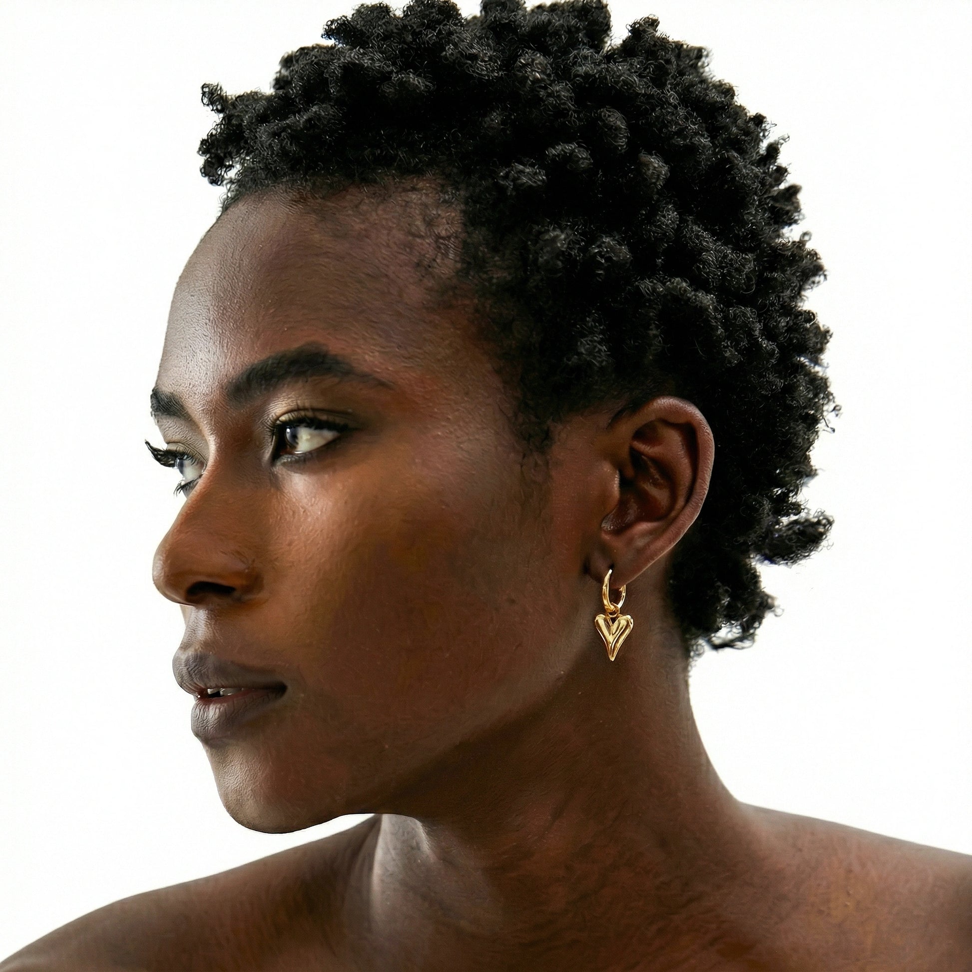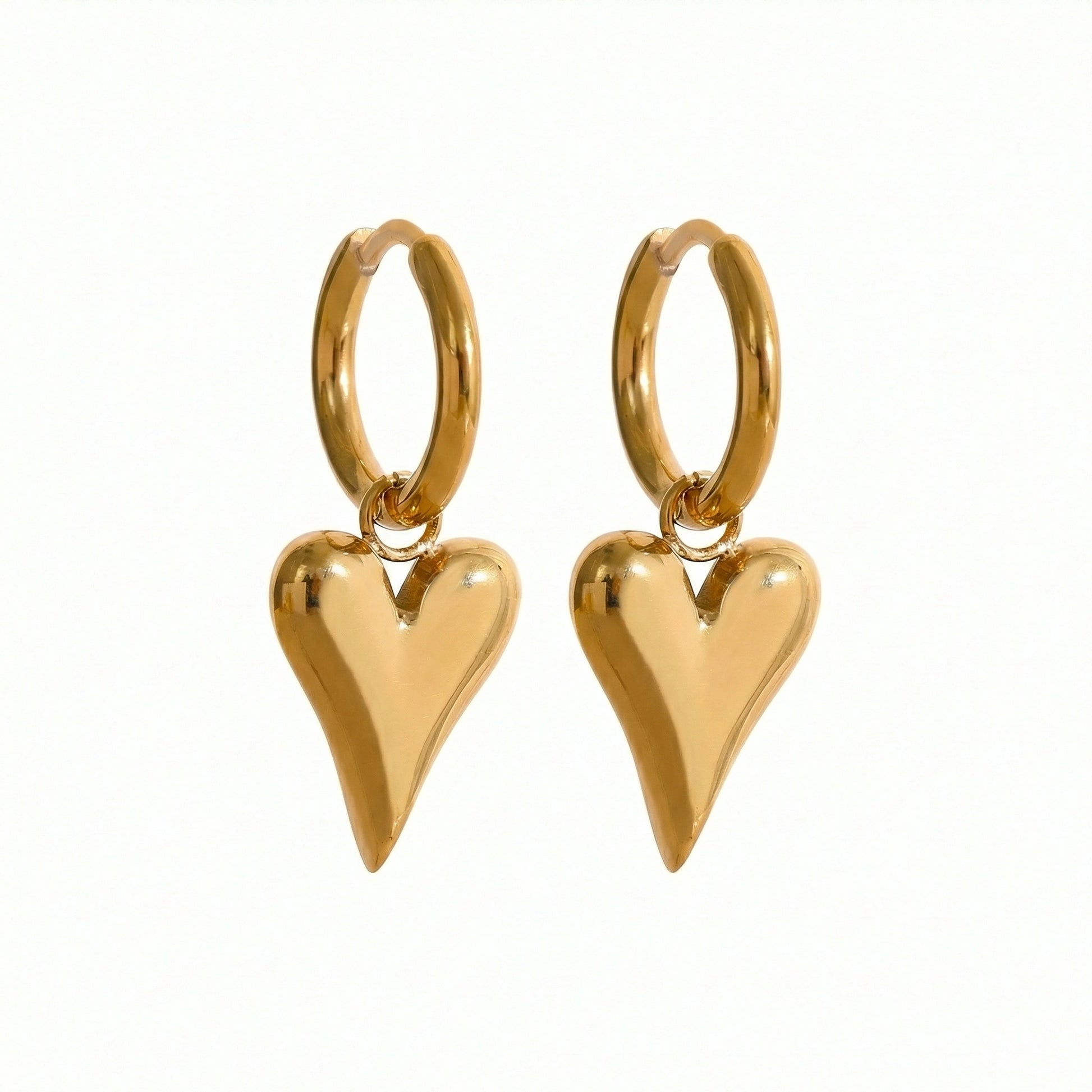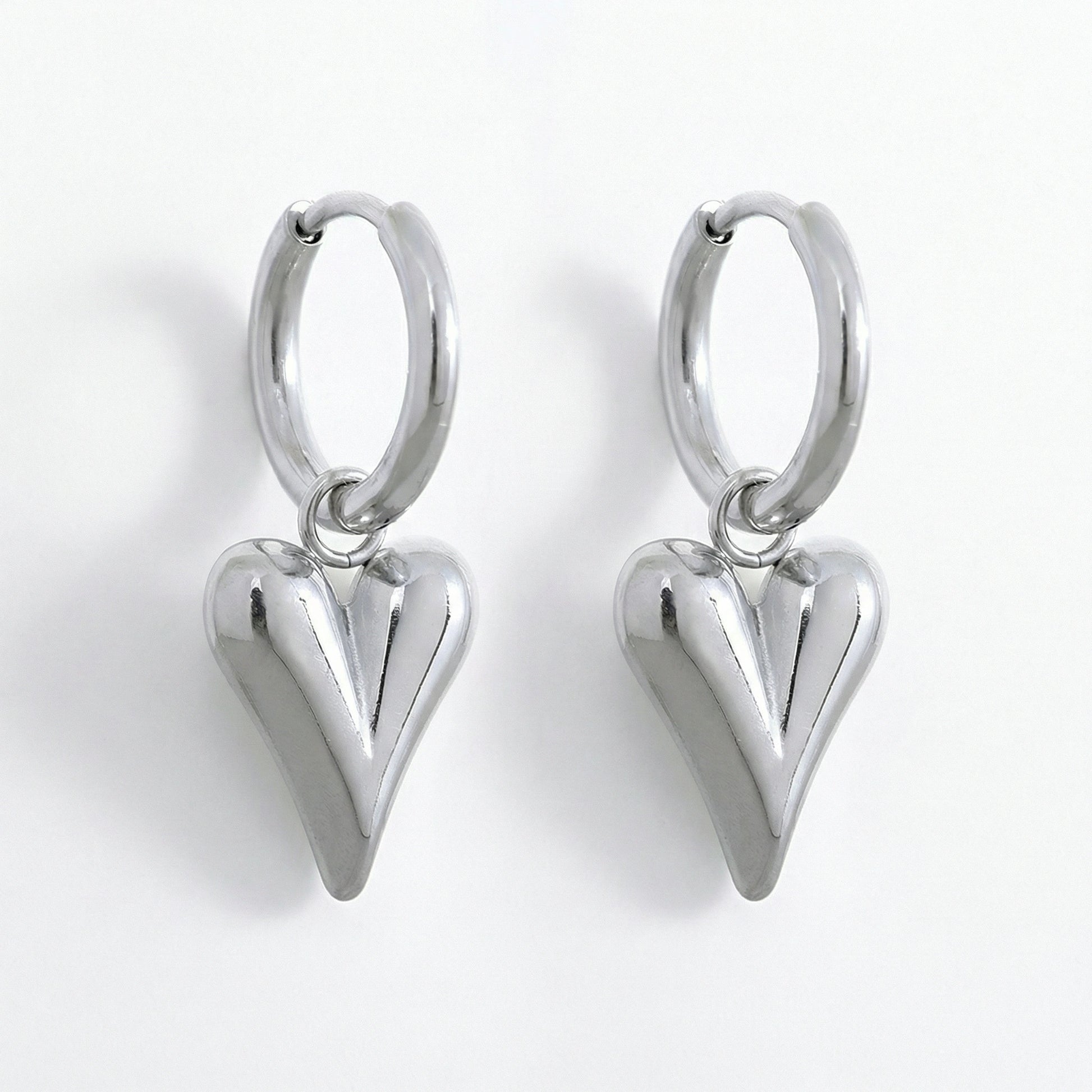 Smooth heart-shaped charms paired with compact huggie hoops create a clean and modern silhouette. A versatile design that balances softness with a solid polished finish for everyday wear