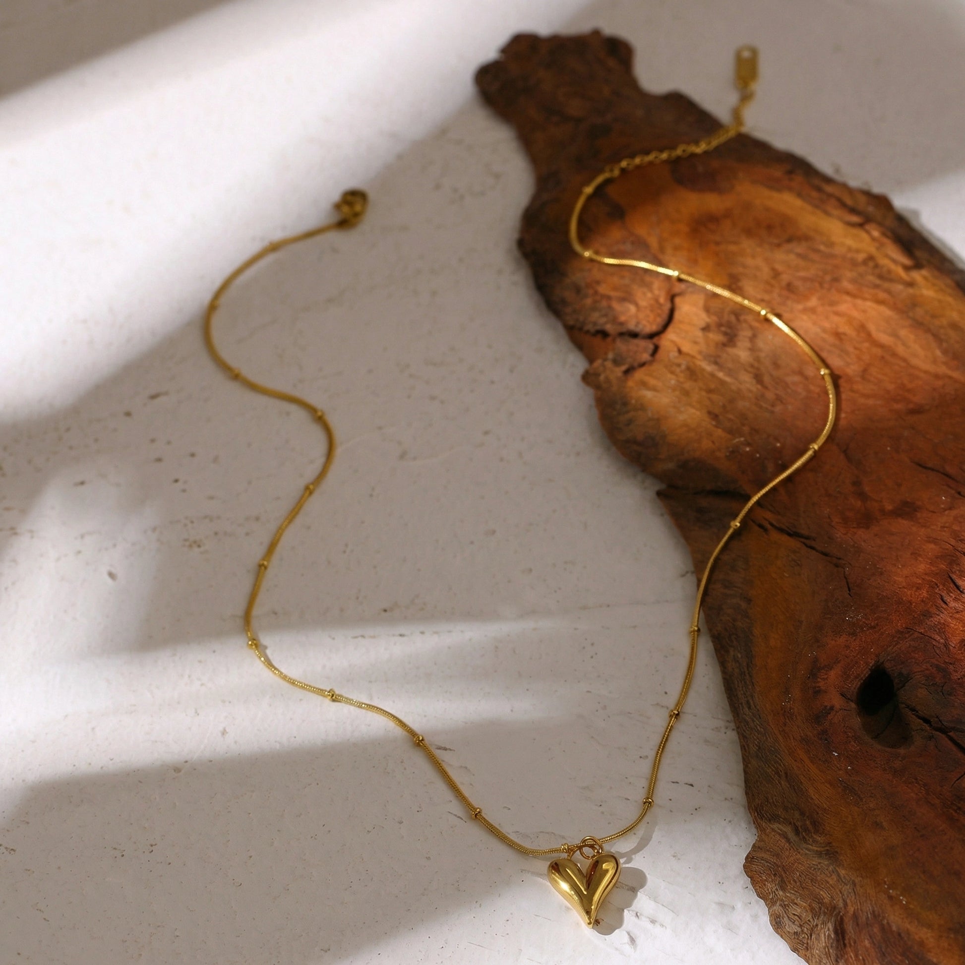 Minimal heart-shaped pendant suspended on a fine chain with subtle bead details. Lightweight, elegant, and designed for everyday wear — worn solo or layered.