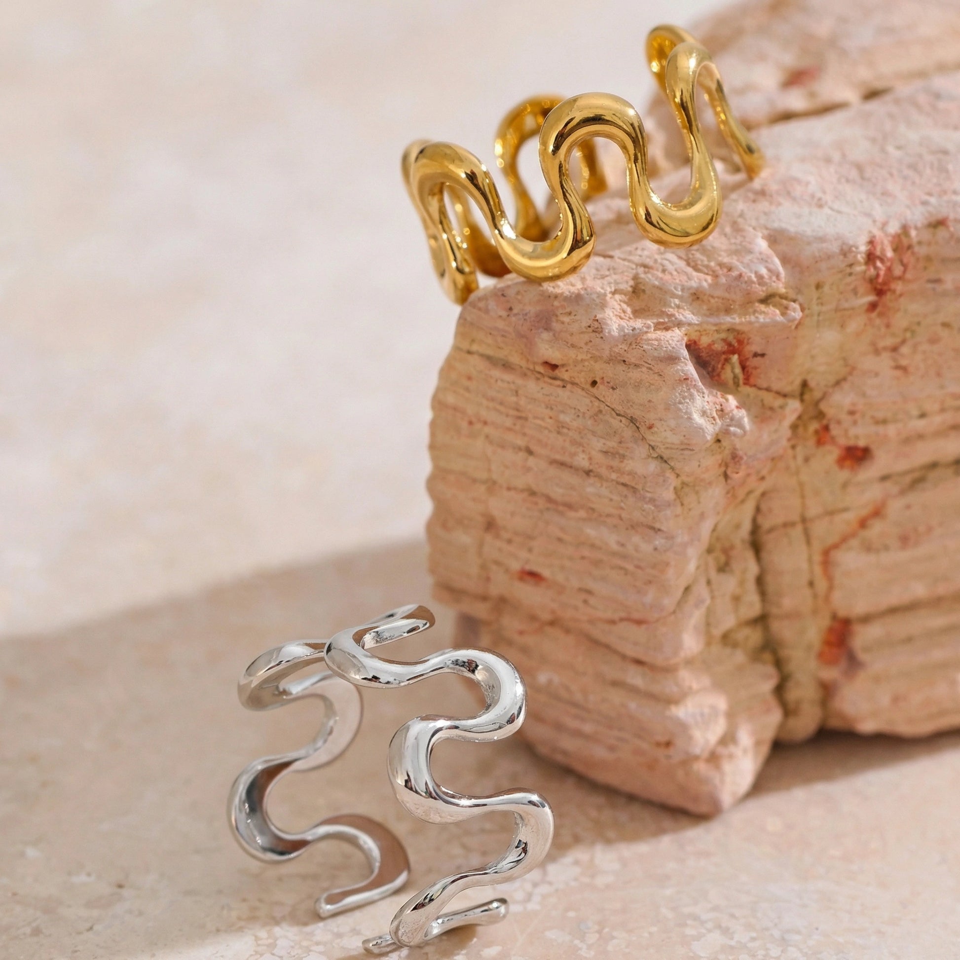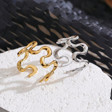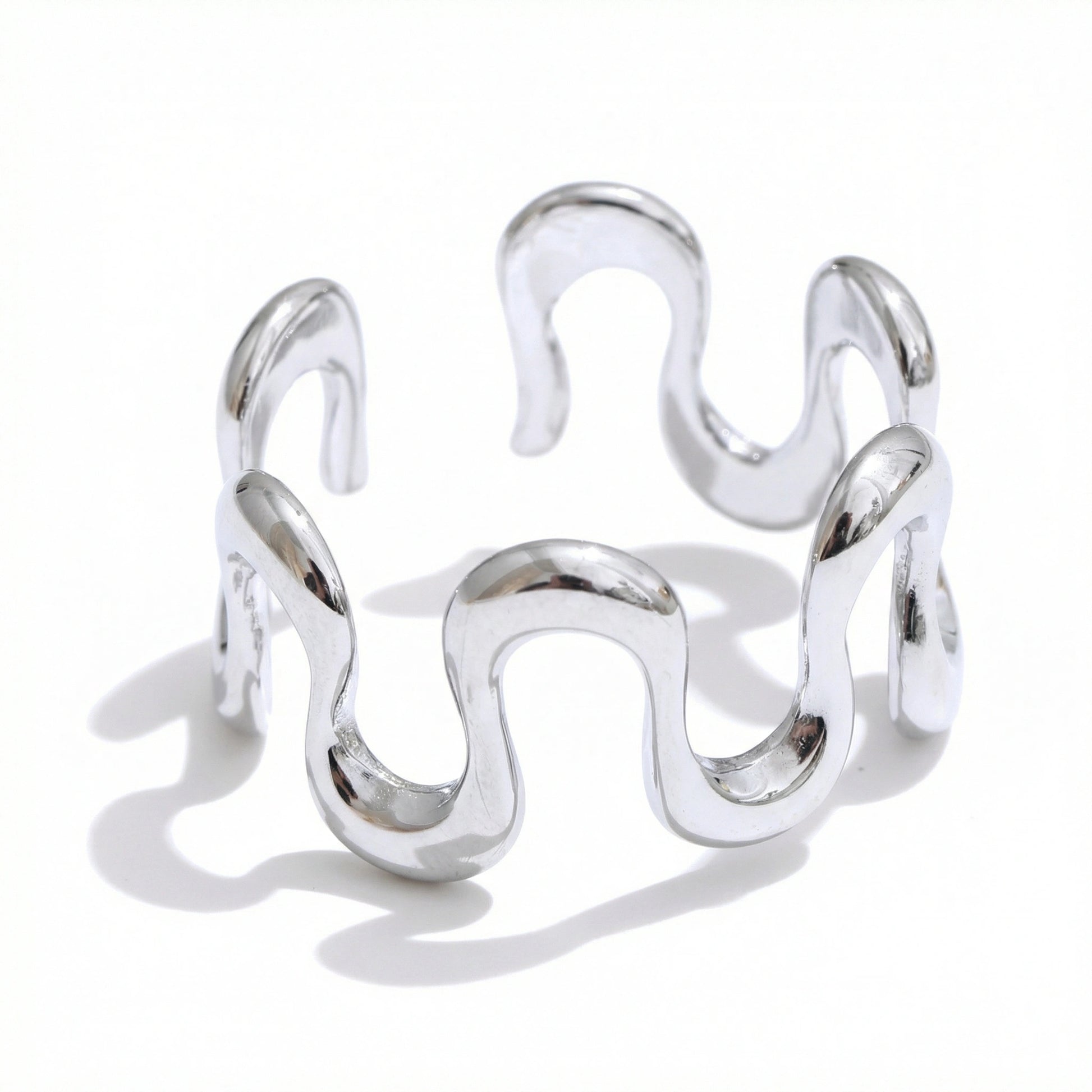 Minimalist ring with an organic, wave-inspired silhouette and a smooth polished finish. Lightweight and sculptural, designed to add subtle movement and modern character to everyday looks, perfect worn solo or stacked with fine bands.