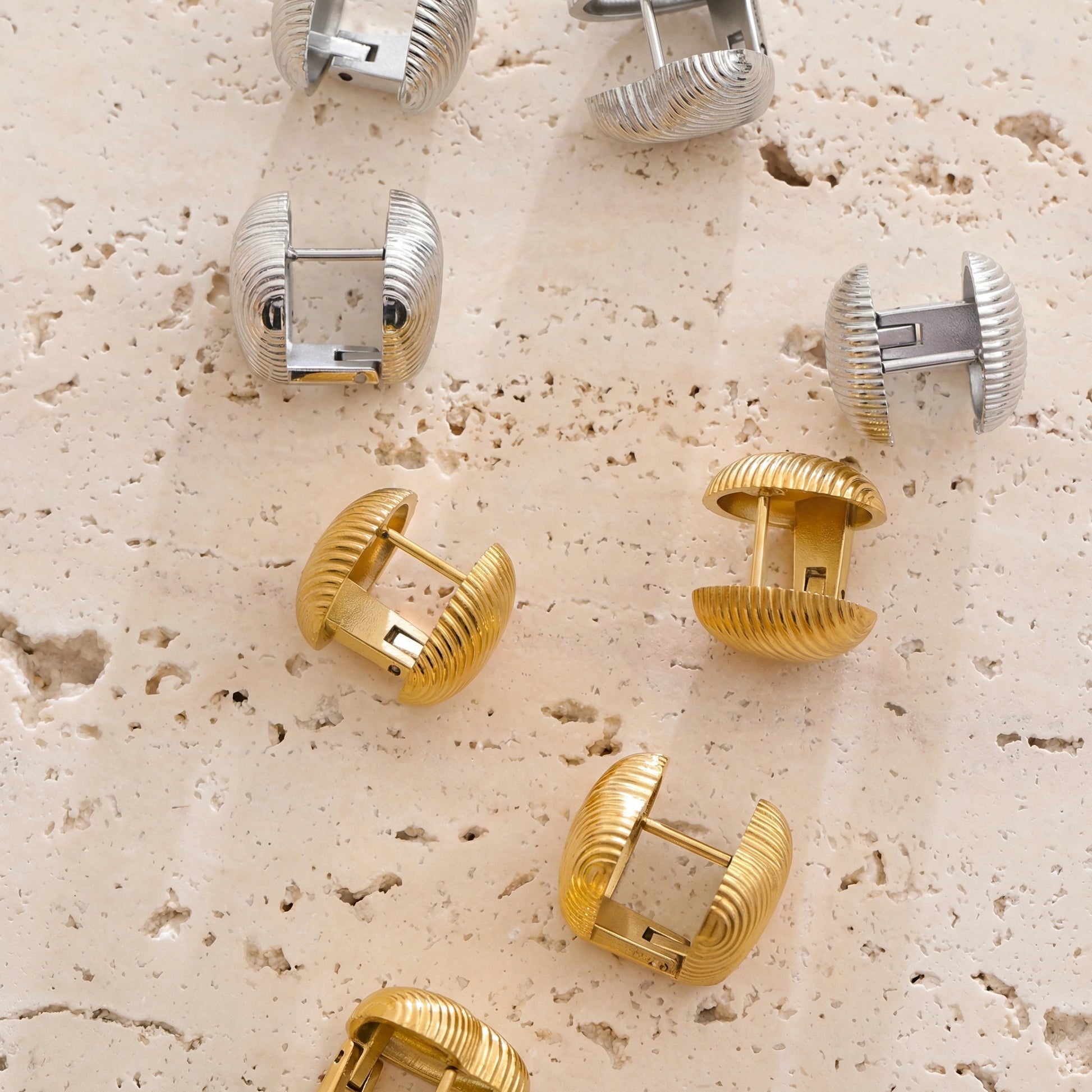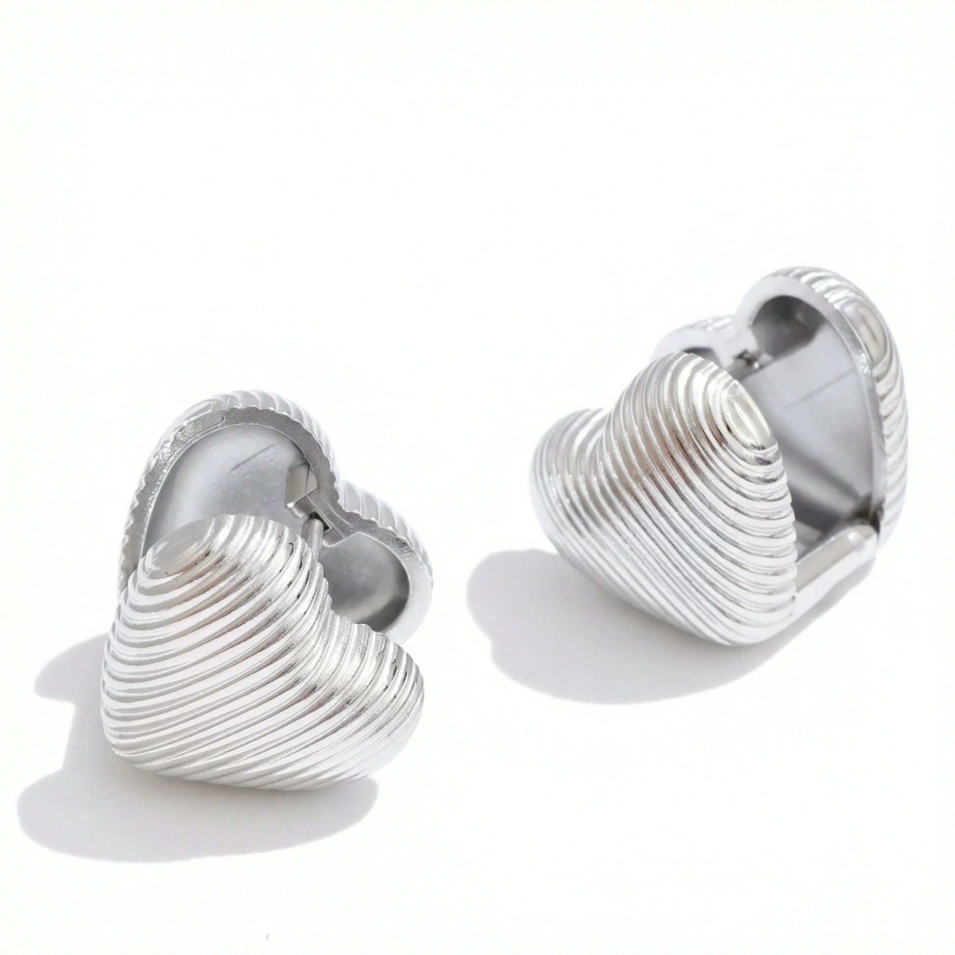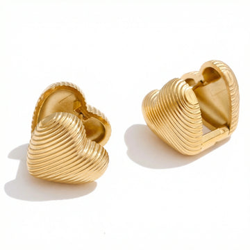 Minimal heart-shaped hoop earrings with a ribbed texture and compact silhouette. Clean, balanced proportions designed for everyday wear. Subtle enough to layer, distinctive enough to stand on their own.