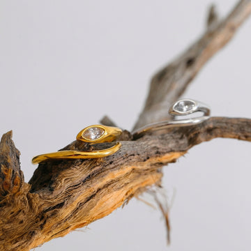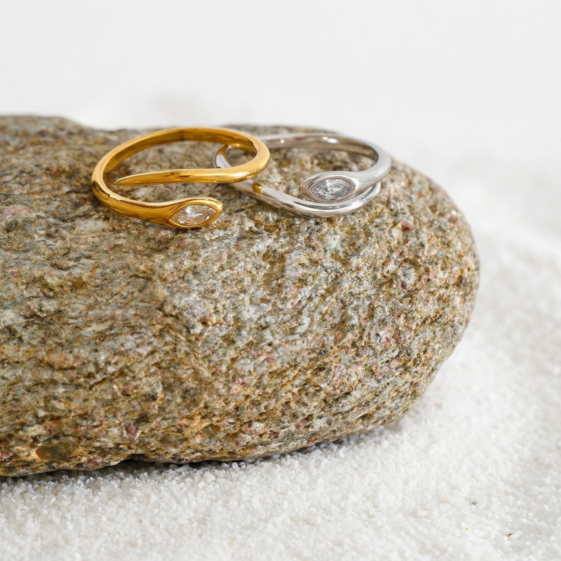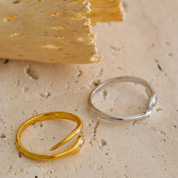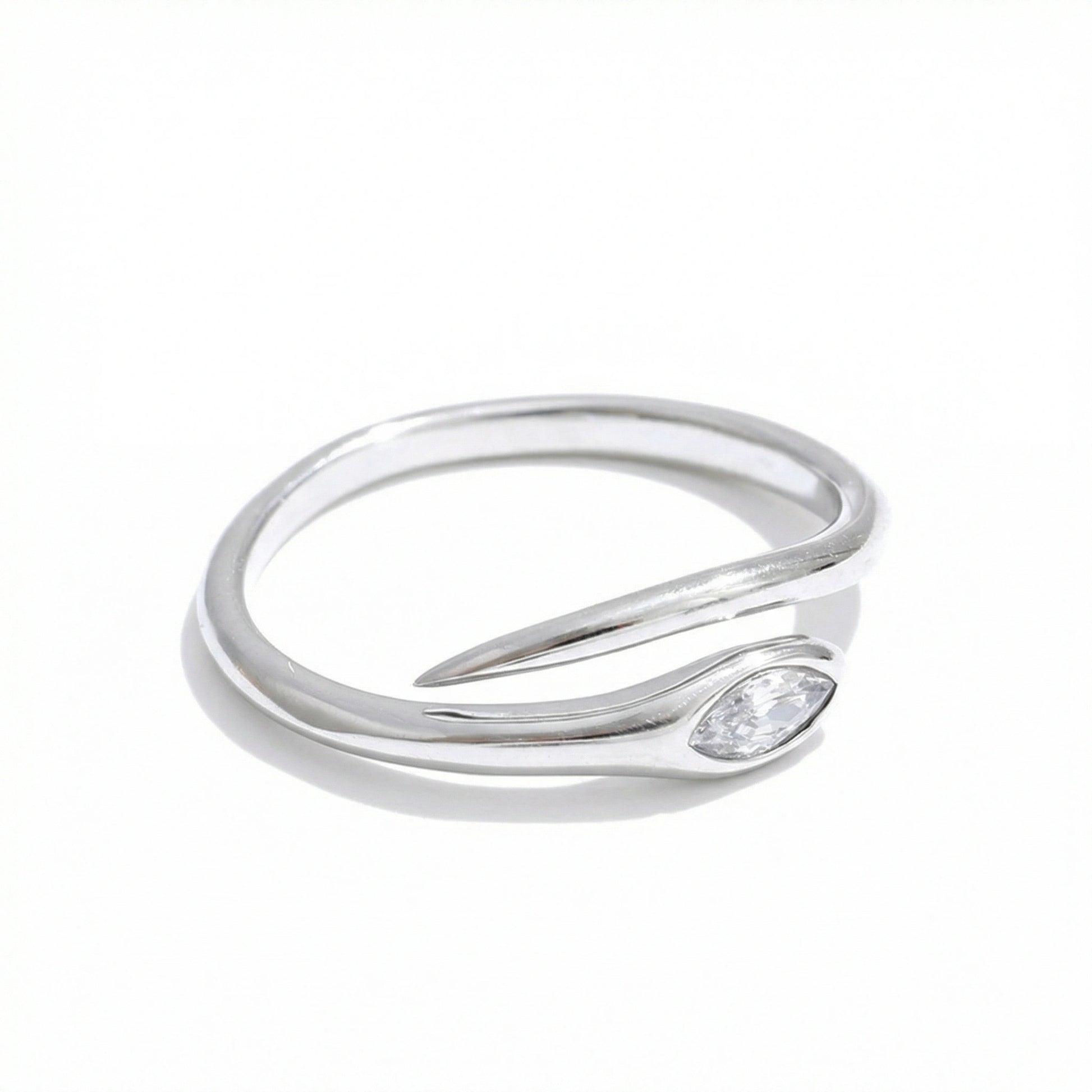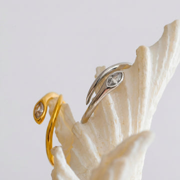 Slim, snake-inspired ring with a smooth, flowing silhouette and a single marquise-cut zircon accent. Lightweight and refined, designed to sit subtly on the finger — perfect for everyday wear, stacking, or minimal styling.