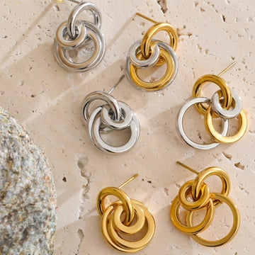 Lightweight drop earrings composed of interlinked circular elements with a smooth, high-polish finish. Designed for everyday wear, they balance subtle movement with a clean, modern silhouette. Minimal yet expressive, perfect for effortless daily styling.