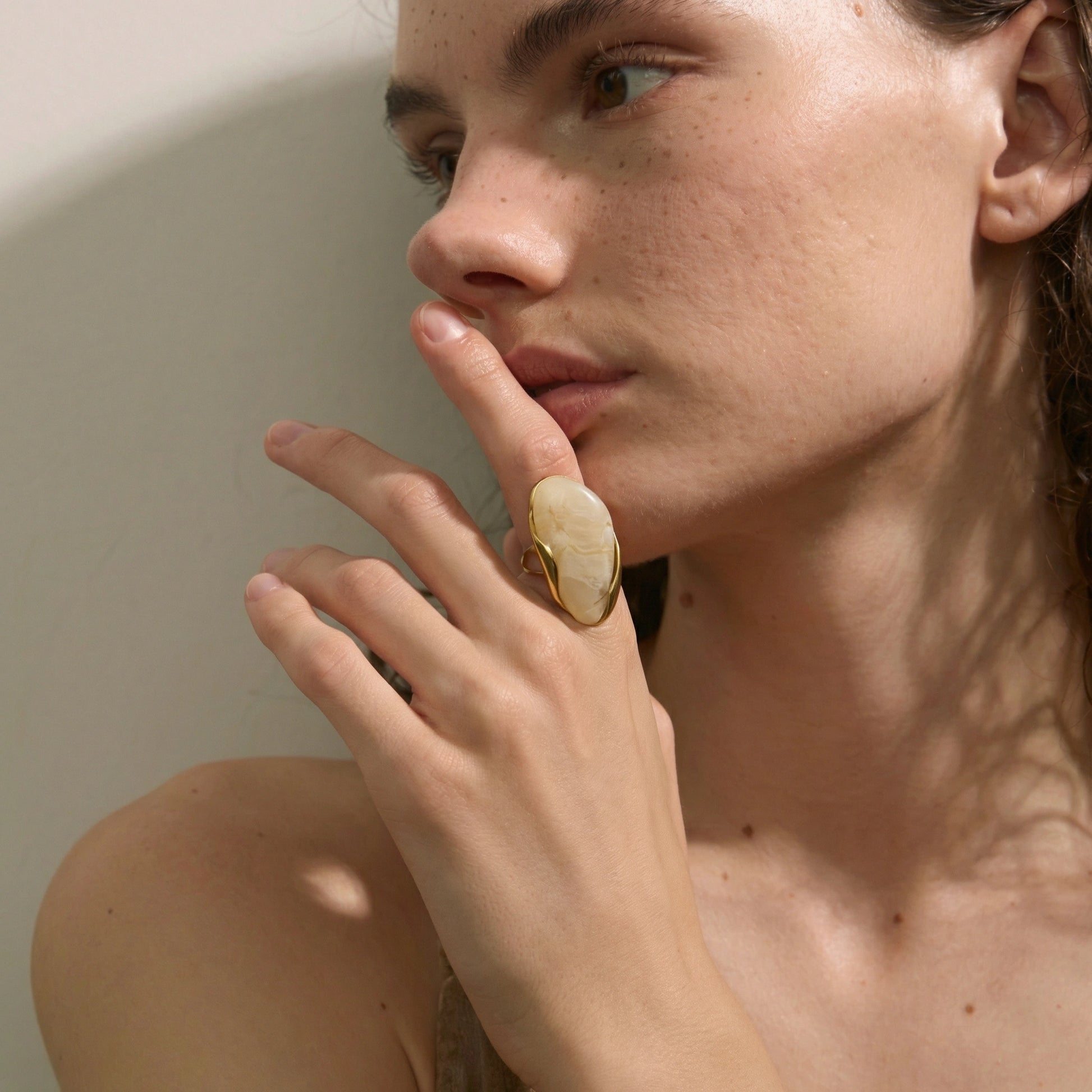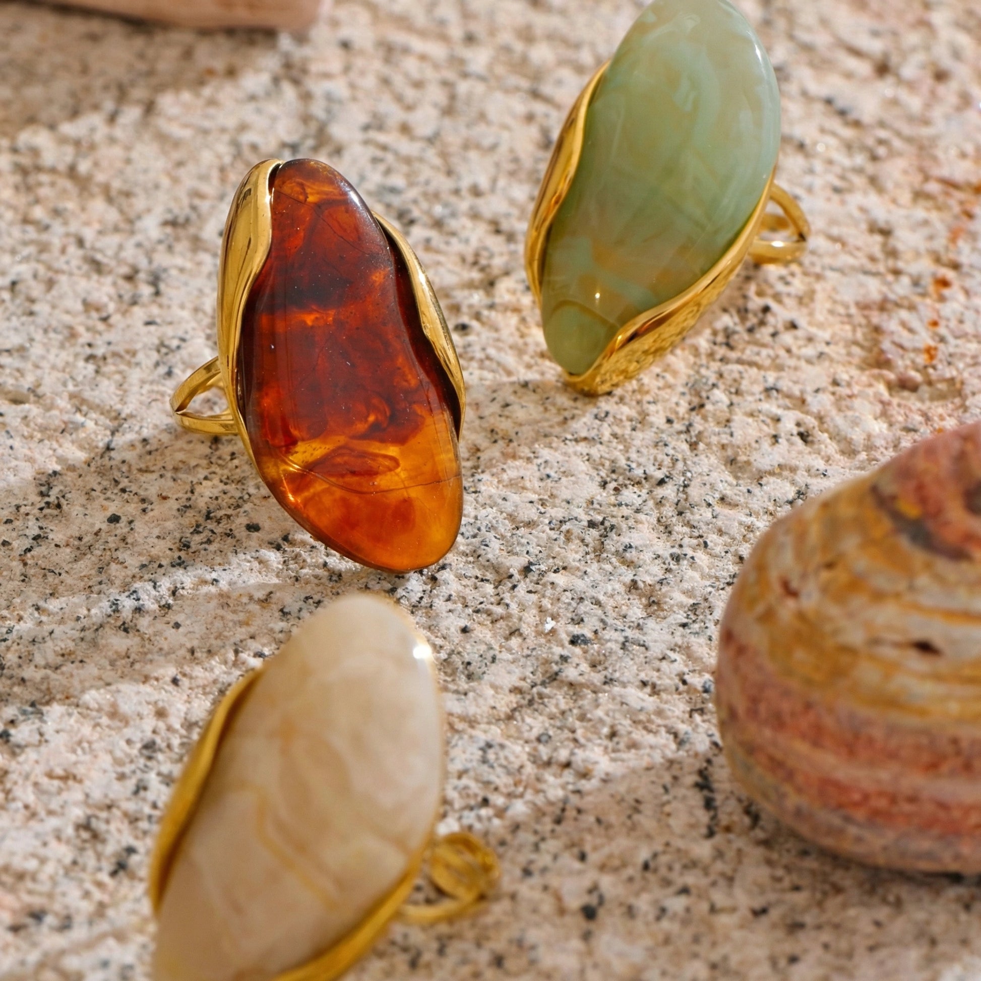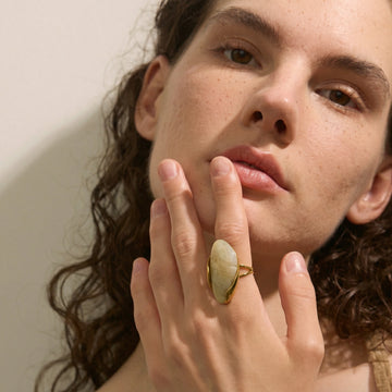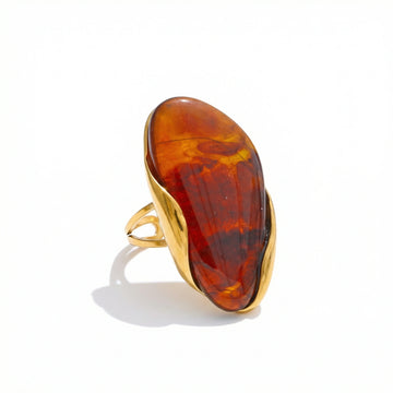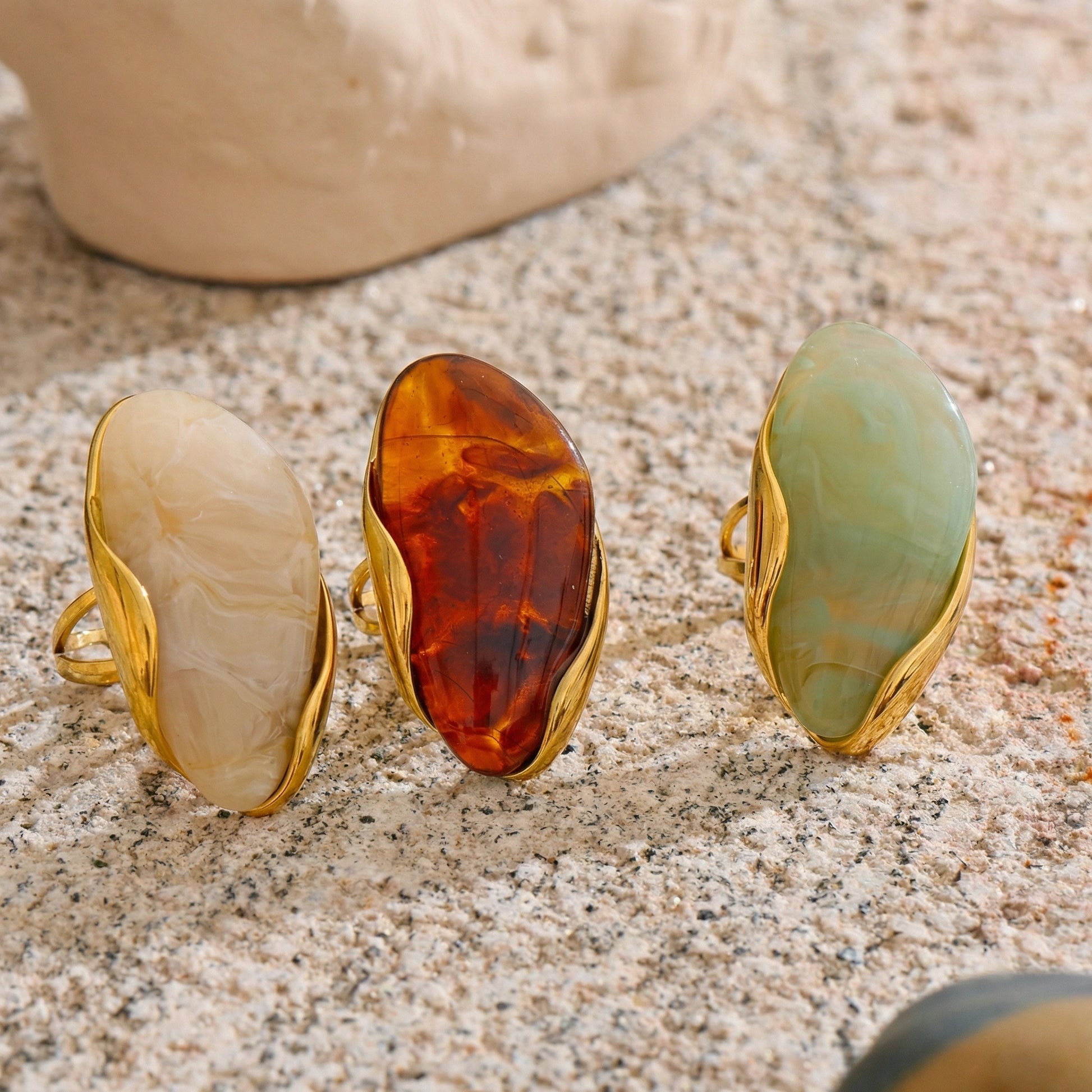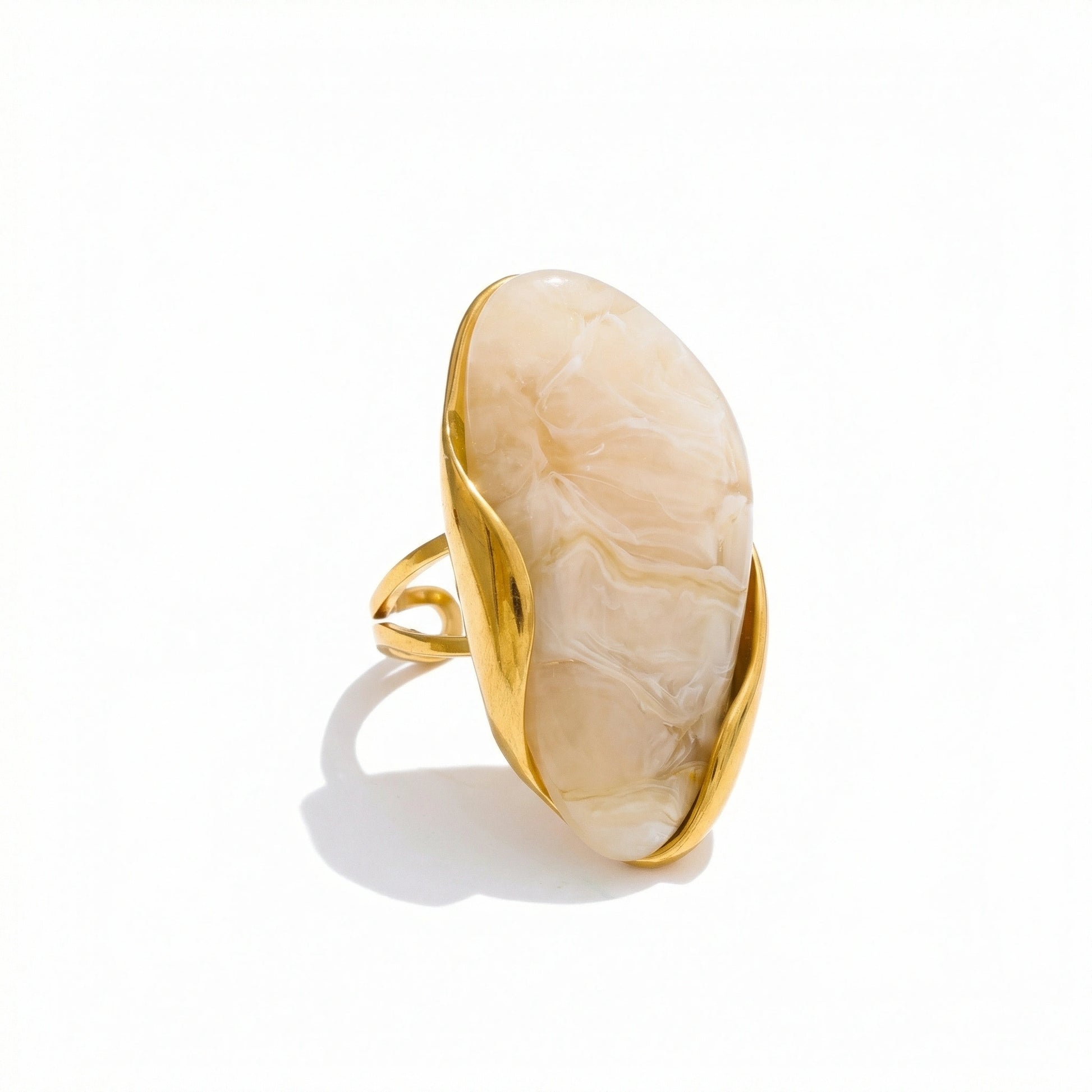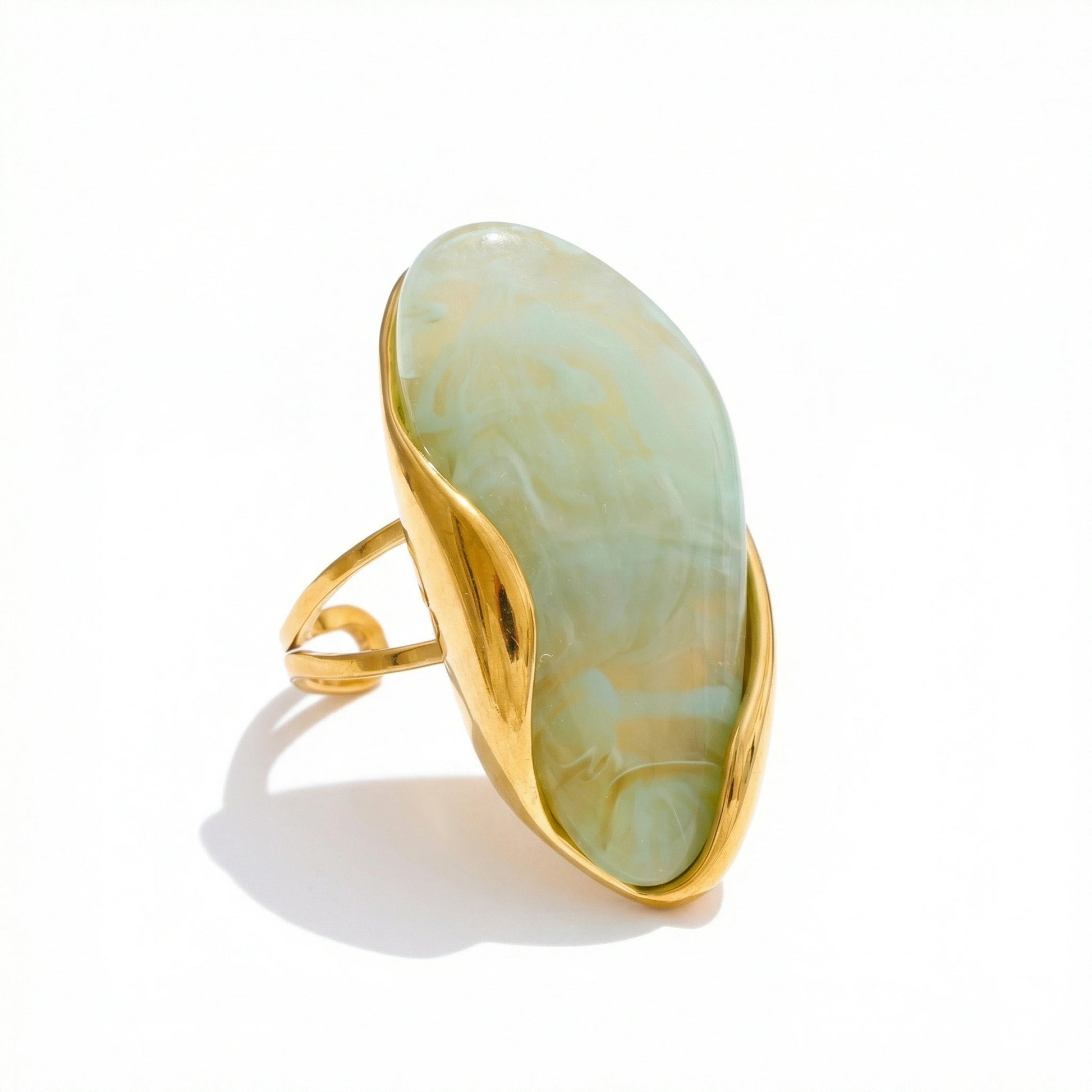 Bold sculptural ring featuring an organic resin form framed in a fluid gold-tone setting. Designed as a statement accessory — expressive, artistic, and unapologetically modern. Each color variation brings a distinct visual character while maintaining a strong, confident silhouette.