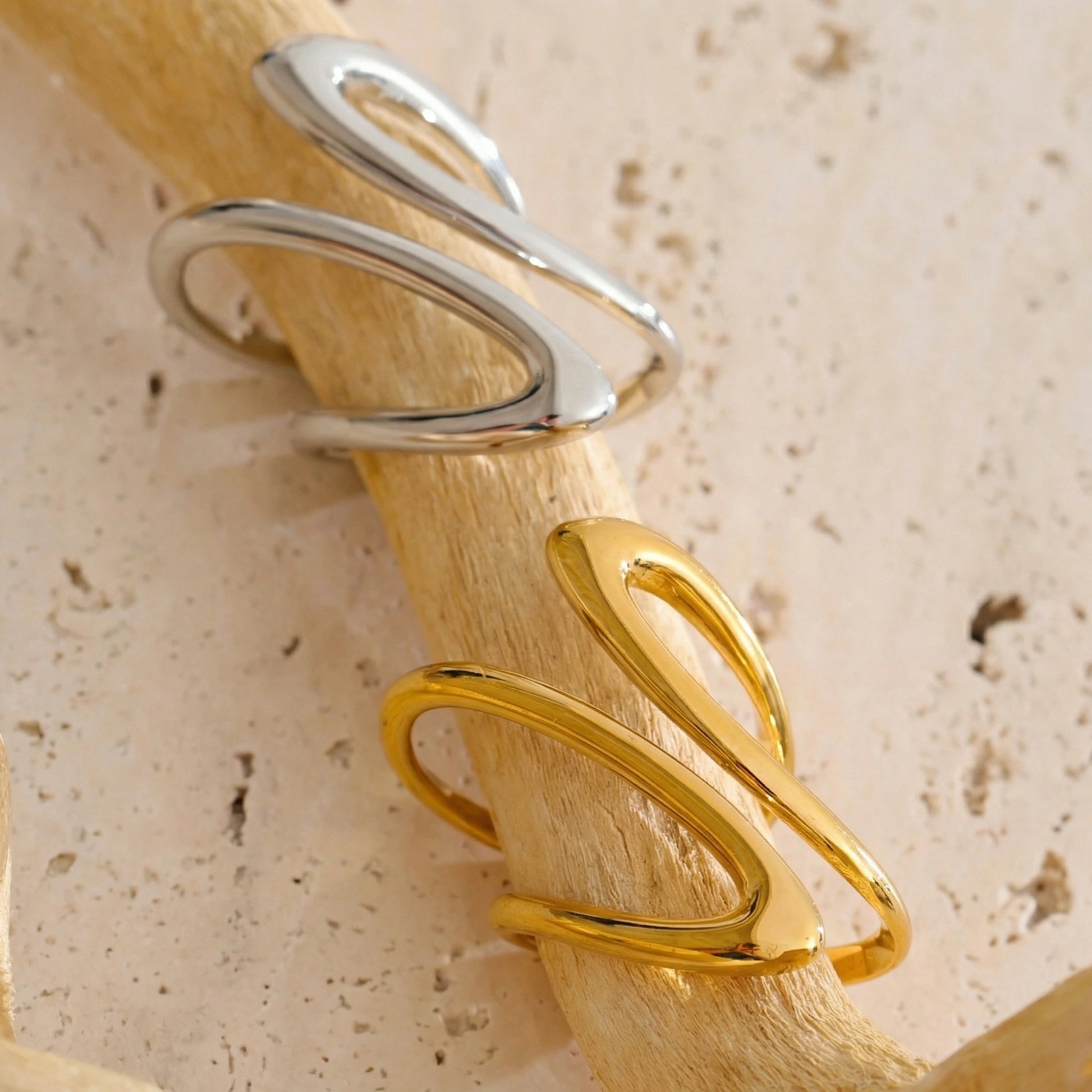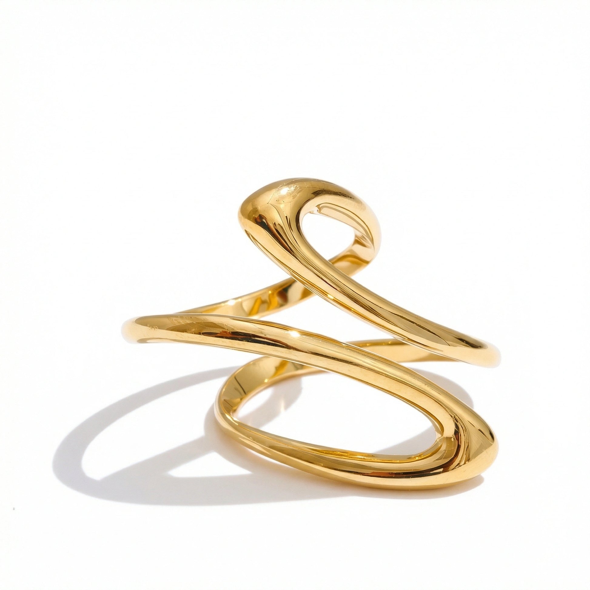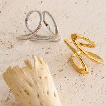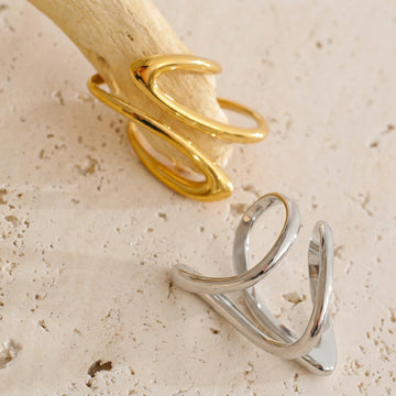 Bold, flowing ring with an abstract, wave-like silhouette. Designed as a modern statement piece that wraps organically around the finger, combining smooth curves with a high-polish finish. Confident and expressive, made to stand out on its own or anchor a minimalist look.