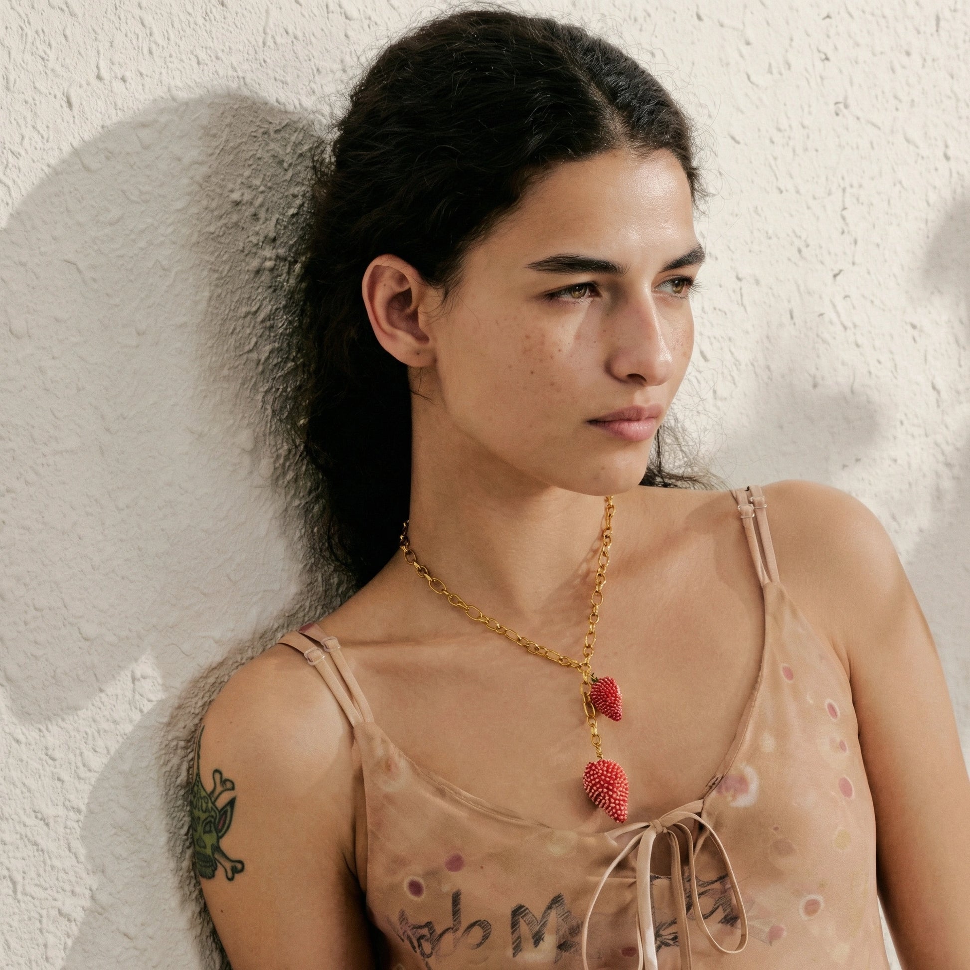 Playful yet bold chain necklace featuring a textured strawberry charm with enamel detailing. Designed as a statement piece that adds a pop of color to everyday looks while remaining durable and wearable year-round.