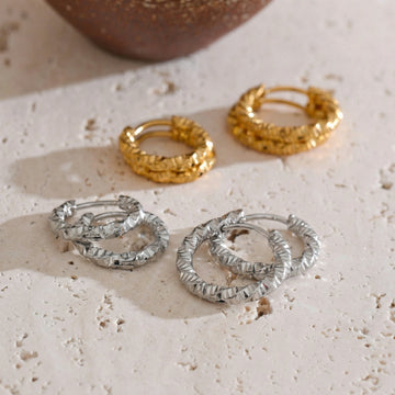 Minimalist round hoop earrings with a faceted textured surface that subtly reflects light. A clean everyday design that works effortlessly on its own or stacked with other earrings.